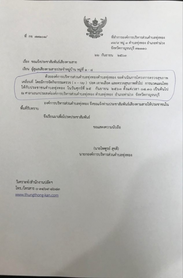 งค์การบริหารส่วนตำบลทุ่งทองจะดำเนินโครงการตวจสุขภาพเคลื่อนที่