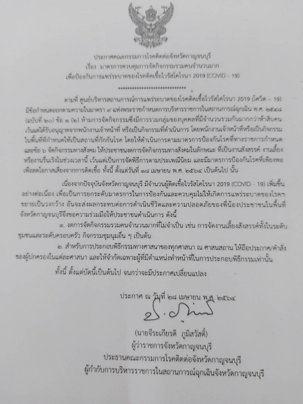 ประกาศคณะกรรมการโรคติดต่อจังหวัดกาญจนบุรี