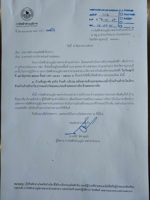 เรื่องการดับกระแสไฟฟ้าชั่วคราว ในเขตพื้นที่ อบต.ทุ่งทอง ตำบลทุ่งทอง อำเภอท่าม่วง จังหวัดกาญจนบุรี ในวันเสาร์ที่ 15 มิถุนายน 2567 ตั้งแต่เวลา 08.30-15.30 น. ซึ่งจะทำให้มีพื้นที่ไฟฟ้าดับตามรายละเอียด ดังนี้