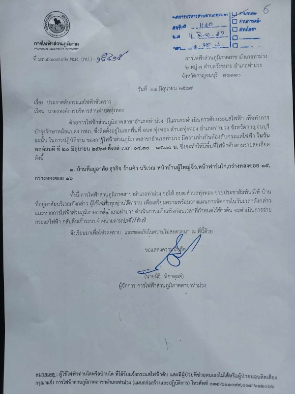 ประกาศดับกระแสไฟฟ้าชั่วคราว ในวันพฤหัสบดีที่ 20 มิถุนายน 2567