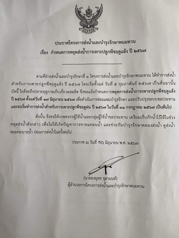 เรื่องกำหนดการหยุดส่งน้ำการเพาะปลูกพืชฤดูแล้ง ปี 2567