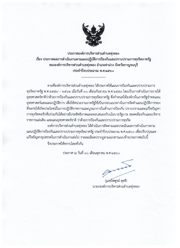 ประกาศผลการดำเนินงานตามแผนปฏิบัติการป้องกันและปราบปรามทุจริตภาครัฐ