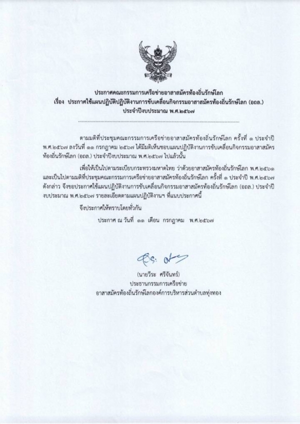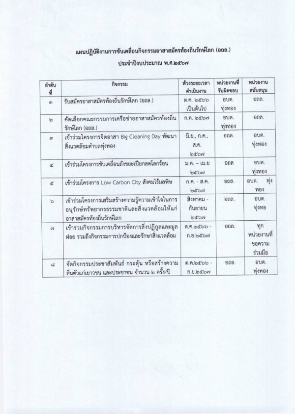 ประกาศใช้แผนปฏิบัติปฏิบัติงานการขับเคลื่อนกิจกรรมอาสาสมัครท้องถิ่นรักษ์โลก (อถล.) ประจำปีงบประมาณ พ.ศ.2567