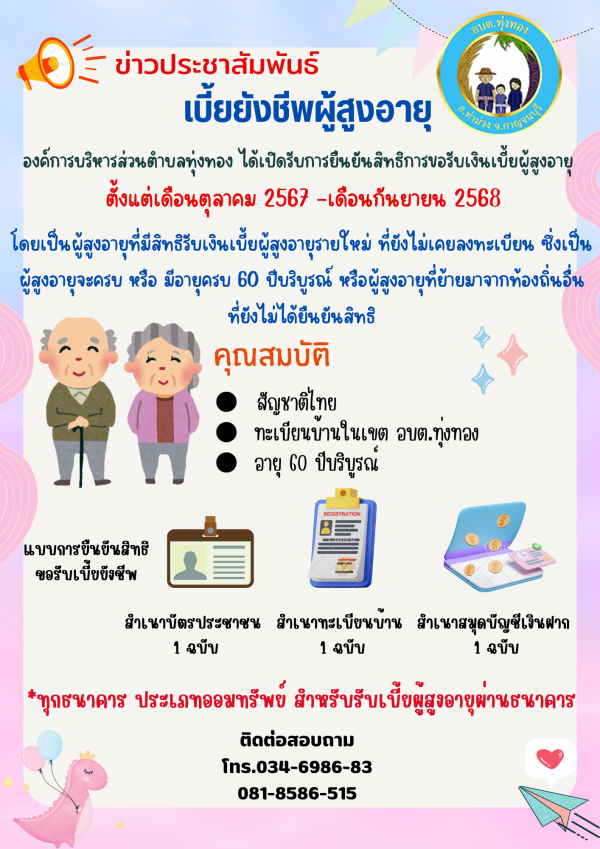องค์การบริหารส่วนตำบลทุ่งทอง ได้เปิดรับการยืนยันสิทธิการขอรับเงินเบี้ยผู้สูงอายุ ตั้งแต่เดือนตุลาคม 2567 - เดือนกันยายน 2568