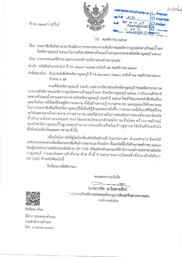 ขยายเวลารับสมัครการประกวดนางงามสันติภาพและธิดากาญจน์สะพานข้ามแม่น้ำแคว จังหวัดกาญจนบุรี 2567