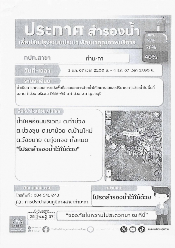 ประชาสัมพันธ์การประปาส่วนภูมิภาคท่ามะกา ประกาศสำรองน้ำเพื่อปรับปรุงระบบประปา