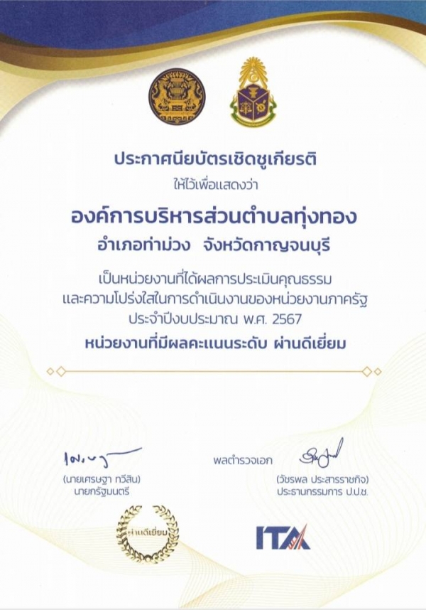 วันจันทร์ที่ 9 ธันวาคม 2567 นายกอบกิจ สบายยิ่ง นายกองค์การบริหารส่วนตำบลทุ่งทอง เป็นตัวแทน อบต.ทุ่งทอง วันป้องกันและปราบปรามการทุจริตแห่งชาติ (ป.ป.ช.) รับรางวัลคุณธรรมและความโปร่งใสในการดำเนินงานของหน่วยงานภาครัฐ ประจำปีงบประมาณ พ.ศ.2567 (ITA) #หน่วยงานที่มีผลคะแนนระดับผ่านดีเยี่ยม 1 ใน 9 อปท.จังหวัดกาญจนบุรี