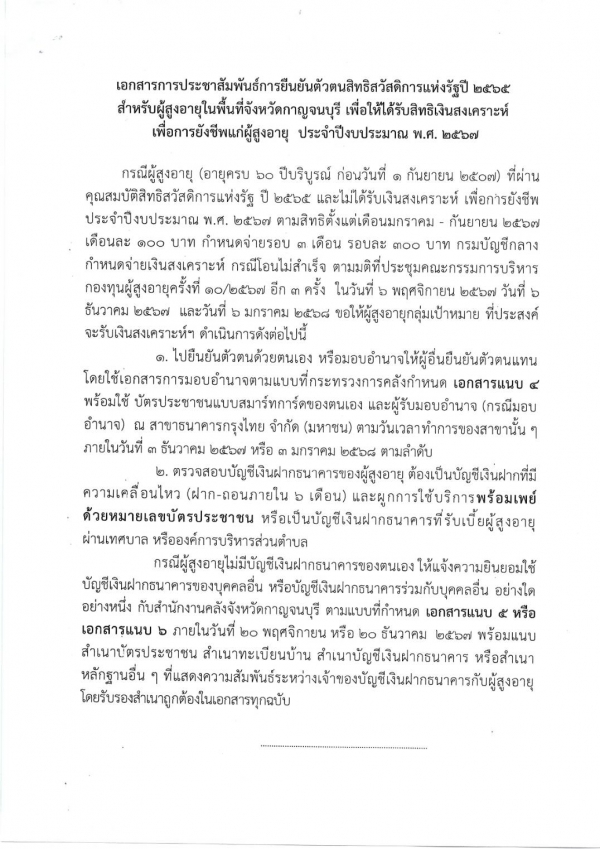 เอกสารประชาสัมพันธ์กาารยืนยันตัวตนสิทธิสวัสดิการแห่งรัฐปี 2565 สำหรับผู้สูงอายุในพื้นที่จังหวัดกาญจนบุรี เพื่อให้ได้รับสิทธิเงินสงเคราะห์ เพื่อการยังชีพแก่ผู้สูงอายุ ประจำปีงบประมาณ พ.ศ.2567