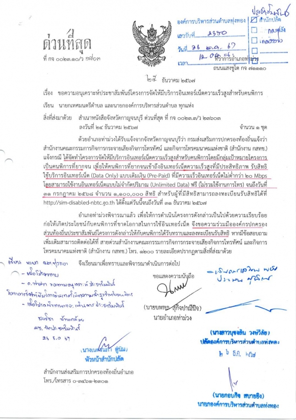 สำนักงานคณะกรรมการกิจการกระจายเสียงกิจการโทรทัศน์ และกิจการโทรคมนาคมแห่งชาติ (สำนักงาน กสทช.) ได้จัดทำโครงการจัดให้มีบริการอินเทอร์เน็ตความเร็วสูงสำหรับคนพิการ โดยมีกลุ่มเป้าหมายโครงการเป็นคนพิการที่ยากจน เพื่อให้คนพิการที่ยากจนเข้าถึงอินเทอร์เน็ตความเร็วสูงที่มีประสิทธิภาพ รับสิทธิใช้อินเทอร์เน็ต (Data Only) แบบเติมเงิน (Pre-Paid) ที่มีความเร็วอินเทอร์เน็ตไม่ต่ำกว่า 20 Mbps โดยสามารถใช้อินเทอร์เน็ตแบบไม่จำกัดปริมาณ (Unlimited Data) ฟรี (ไม่รวมใช้งานการโทร) จนถึงวันที่ 31 กรกฎาคม 2567 จำนวน 1,100,000 สิทธิ