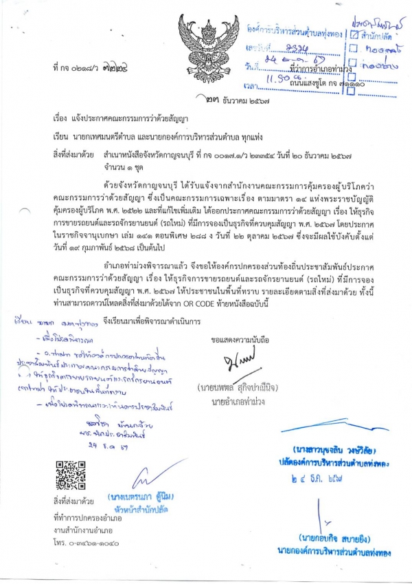 ประชาสัมพันธ์ประกาศคณะกรรมการว่าด้วยสัญญา เรื่อง ให้ธุรการขายรถยนต์และรถจักรยานยนต์ (รถใหม่) ที่มีการจองเป็นธุรกิจที่ควบคุมสัญญา พ.ศ. 25671 ให้ประชาชนในพื้นที่ทราบ