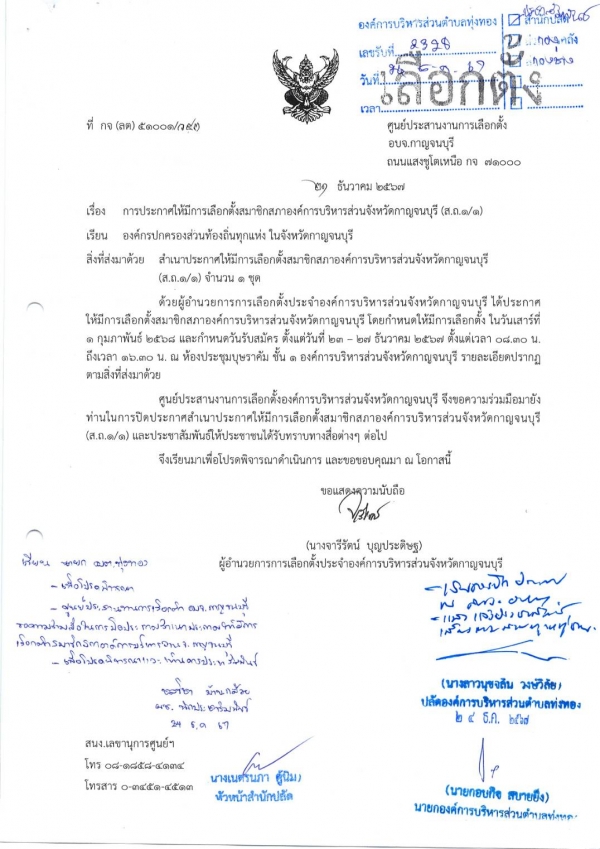 การประกาศให้มีการเลือกตั้งสมาชิกสภาองค์การบริหารส่วนจังหวัดกาญจนบุรี (ส.ถ.1/1)