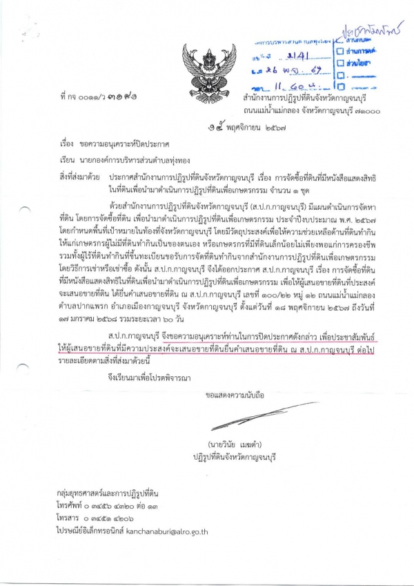 ขอความอนุเคราะห์ปิดประกาศ เรื่อง การจัดซื้อที่ดินที่มีหนังสือแสดงสิทธิในที่ดินเพื่อนำมาดำเนินการปฏิรูปที่ดินเพื่อเกษตรกรรม จำนวน 1 ชุด