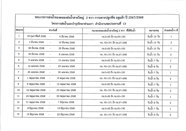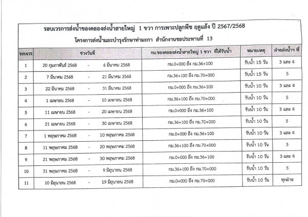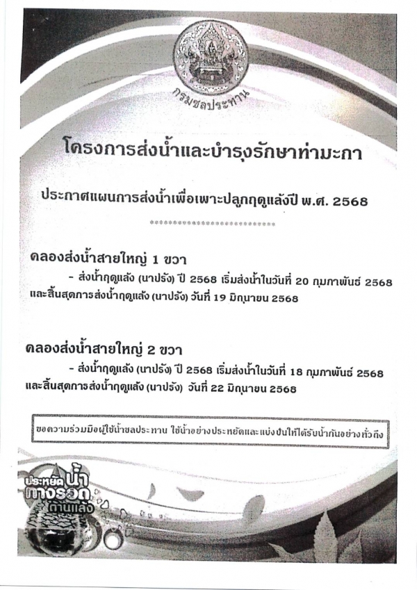 ข่าวประชาสัมพันธ์โครงการส่งน้ำและบำรุงรักษาท่ามะกา ประกาศแผนการส่งน้ำเพื่อเพาะปลูกฤดูแล้งปี พ.ศ. 2568