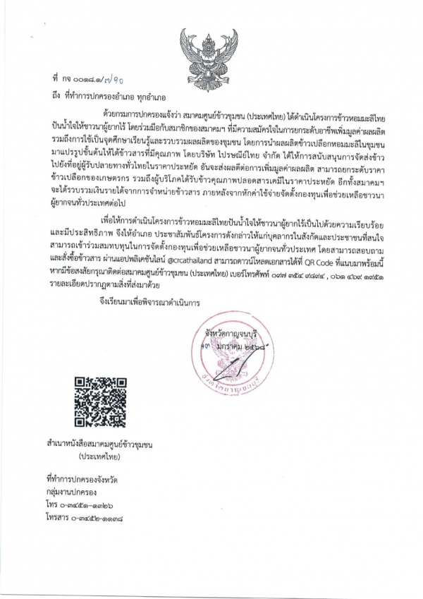 ข่าวประชาสัมพันธ์โครงการข้าวหอมมะลิไทยปันน้ำใจให้ชาวนาผู้ยากไร้ ประชาชนที่สนใจสามารถเข้าร่วมสมทบทุนในการจัดตั้งกองทุนเพื่อช่วยเหลือชาวนาผู้ยากจนทั่วประเทศ โดยสามารถสอบถามและสั่งซื้อข้าวสาร ผ่านแอปพิเคชั่นไลน์ @crcathailand หรือสามารถโทรสอบถามได้ที่เบอร์ 097-354-9894