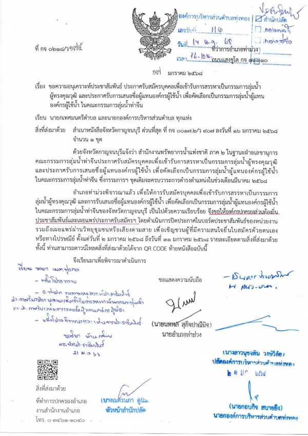 ประชาสัมพันธ์ ประกาศรับสมัครบุคคลเพื่อเข้ารับการสรรหาเป็นกรรมการลุ่มน้ำผู้ทรงคุณวุฒิ และประกาศรับเสนอชื่อผู้แทนองค์กรผู้ใช้น้ำ เพื่อคัดเลือกเป็นกรรมการลุ่มน้ำผู้แทนองค์กรผู้ใช้น้ำ ในคณะกรรมการลุ่มน้ำท่าจีน