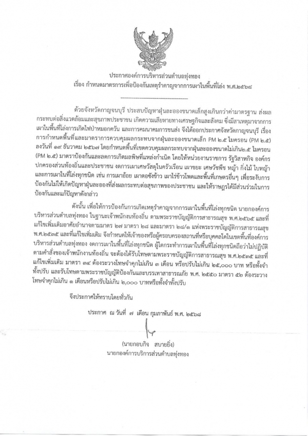 ประกาศองค์การบริหารส่วนตำบลทุ่งทอง เรื่อง กำหนดมาตรการเพื่อป้องกันเหตุรำคาญจากการเผาในพื้นที่โล่ง พ.ศ.2568