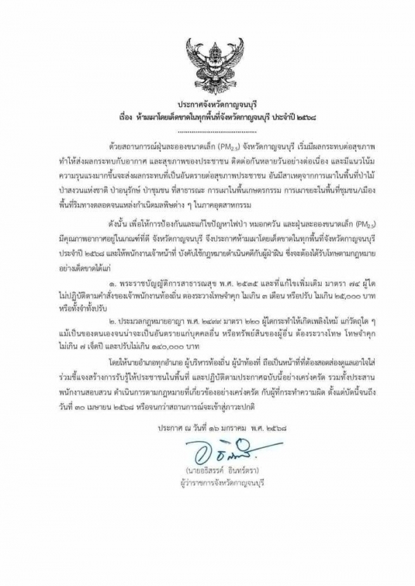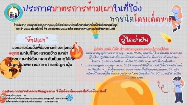 ประกาศ เรื่องห้ามเผาโดยเด็ดขาดในทุกพื้นที่จังหวัดกาญจนบุรี ประจำปี 2568