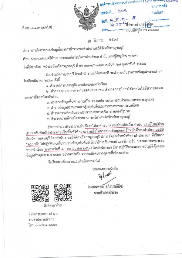 ข่าวประชาสัมพันธ์ เรื่อง การเก็บรวบรวมข้อมูลโครงการสำรวจของสำนักงานสถิติจ.กาญจนบุรี