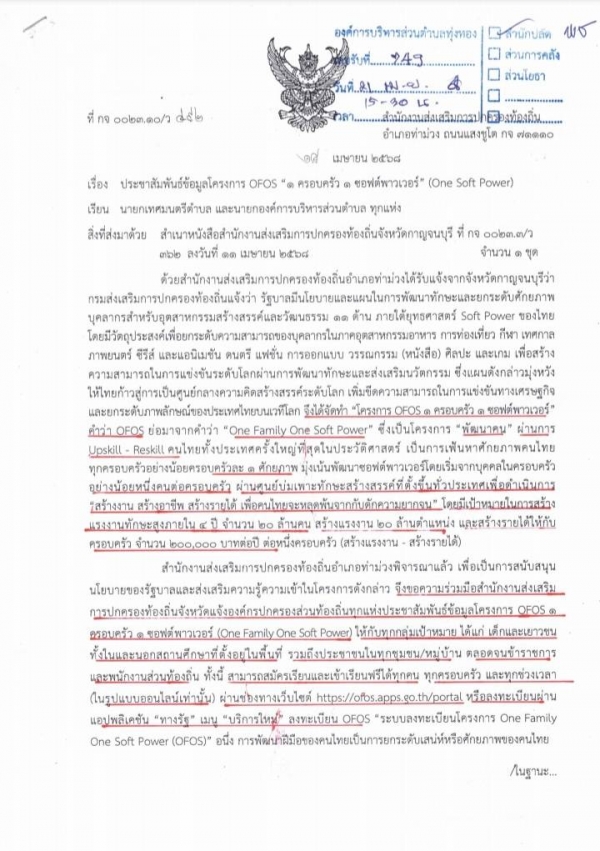 ประชาสัมพันธ์ข้อมูลโครงการ OFOS 1 ครอบครัว 1 ซอฟต์พาวเวอร์ (One Soft Power)