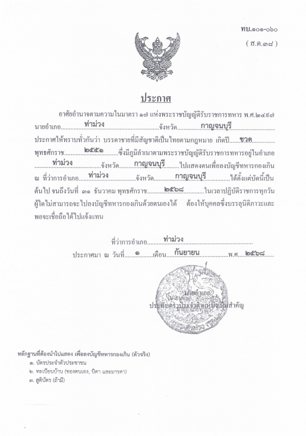 ข่าวประชาสัมพันธ์ ประกาศให้ชายที่มีสัญชาติไทยไปแสดงตนเพื่อลงบัญชีทหารกองเกิน ณ ที่ว่าการอำเภอท่าม่วง ภายใน พ.ศ. 2568