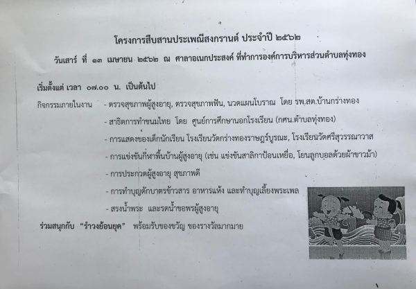 ขอเชิญชวนชาวตำบลทุ่งทองเข้าร่วมงานโครงการสืบสานประเพณีสงกรานต์ ประจำปี2562 นะคะ
