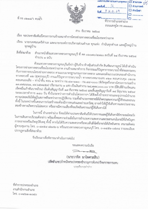 ข่าวประชาสัมพันธ์โครงการงานจ้างเหมาทำการโครงข่ายทางหลวงเชื่อมโยงระหว่างภาค