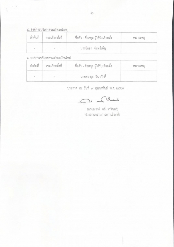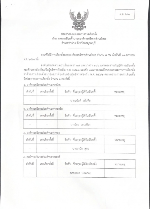 ประกาศคณะกรรมการการเลือกตั้ง เรื่อง ผลการแต่งตั้งนายกองค์การบริหารส่วนตำบล อ.ท่าม่วง จ.กาญจนบุรี