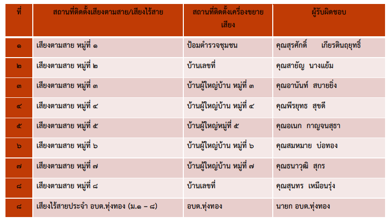 องค์การบริหารส่วนตำบลทุ่งทอง มีการติดตั้งเสียงตามสาย/เสียงไร้สาย และให้บริการครบทุกหมู่บ้าน