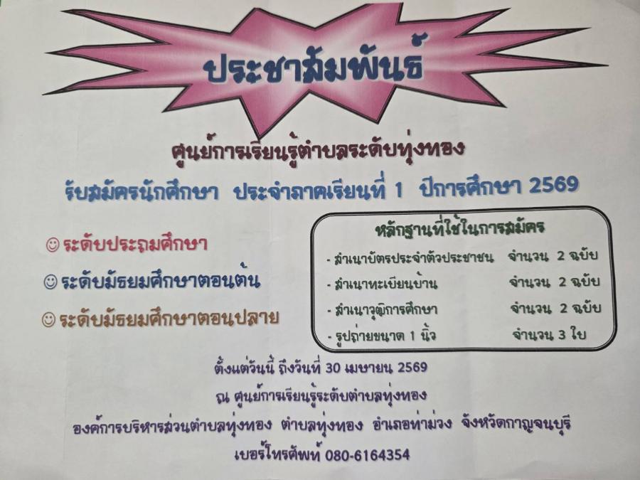 ข่าวประชาสัมพันธ์ ศูนย์ส่งเสริมการเรียนรู้ระดับอำเภอท่าม่วง เปิดรับสมัครนักศึกษาในระดับประถมศึกษา มัธยมศึกษาตอนต้น มัธยมศึกษาตอนปลาย และประกาศนียบัตรวิชาชีพ(ปวช.) ประจำภาคเรียนที่ 1 ปีการศึกษา 2569