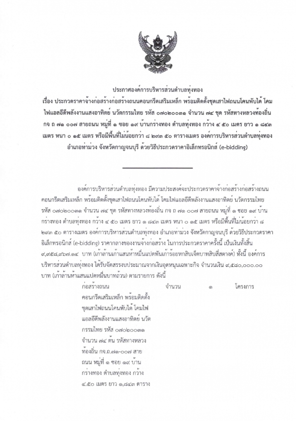 ประกาศประกวดราคาจ้างก่อสร้างถนนคอนกรีตเสริมเหล็กพร้อมติดตั้งชุดเสาไฟถนนโคนพับได้ โคมไฟแอลอีดีพลังงานเเสงอาทิตย์ นวัตกรรมไทย รหัส 07020031 จำนวน 74 ชุด