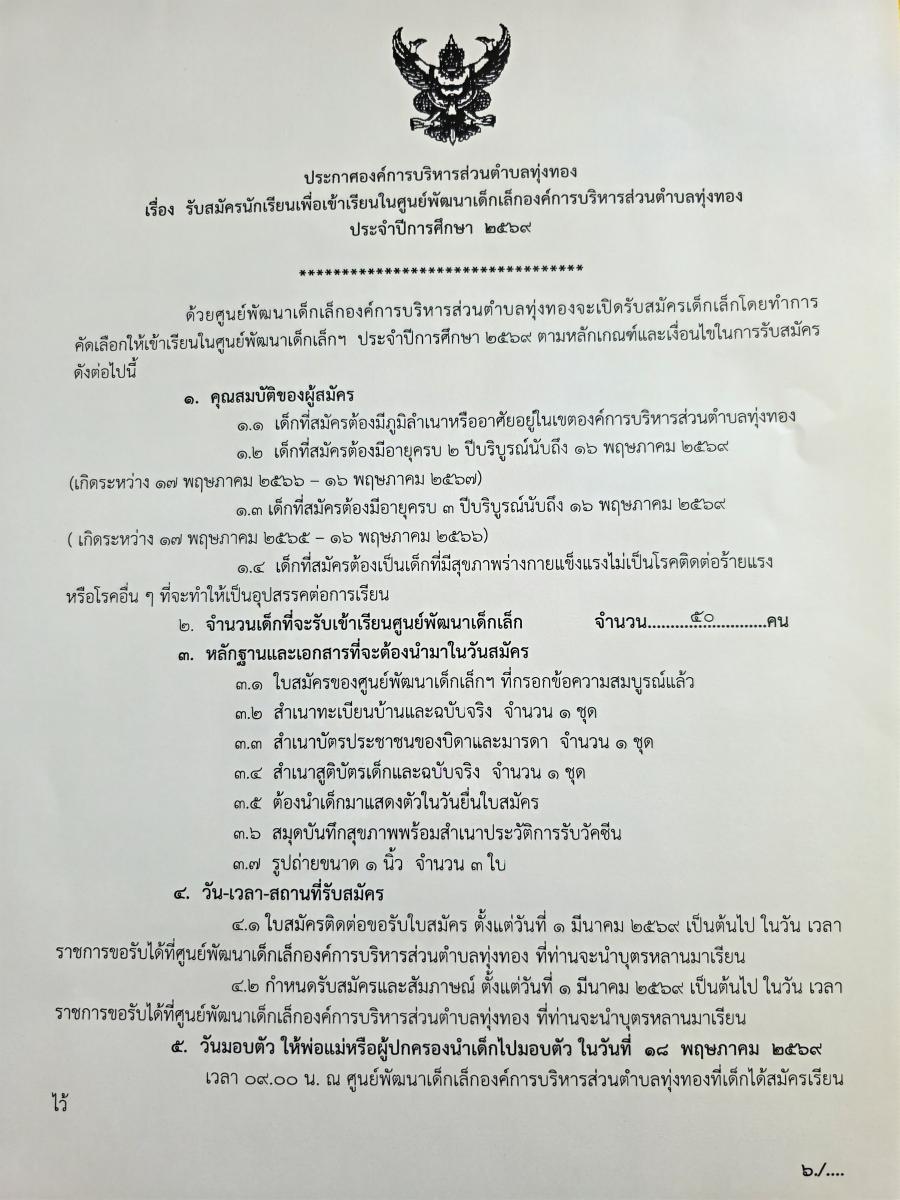 ประกาศองค์การบริหารส่วนตำบลทุ่งทอง เรื่อง รับสมัครนักเรียนเพื่อเข้าเรียนในศูนย์พัฒนาเด็กเล็กองค์การบริหารส่วนตำบลทุ่งทอง