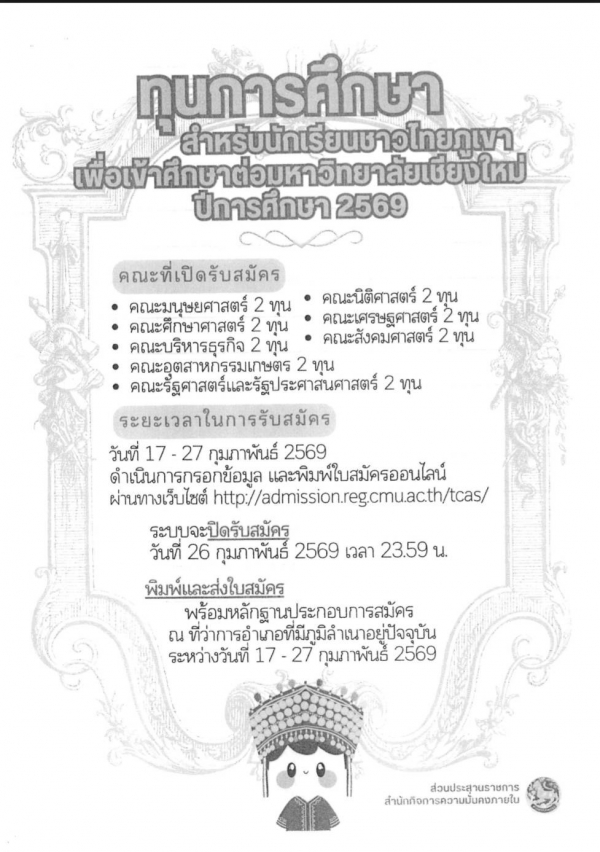 ข่าวประชาสัมพันธ์การรับสมัครนักศึกษาตามโครงการจัดส่งนักศึกษาชาวไทยภูเขาเข้าศึกษาต่อมหาวิทยาลัย ประจำปีการศึกษา 2569 ของมหาวิทยาลัยเชียงใหม่