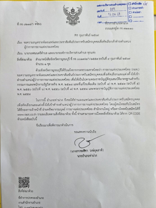 ประกาศคณะกรรมการการเลือกตั้ง เรื่อง ผลการแต่งตั้งนายกองค์การบริหารส่วนตำบล อ.ท่าม่วง จ.กาญจนบุรี