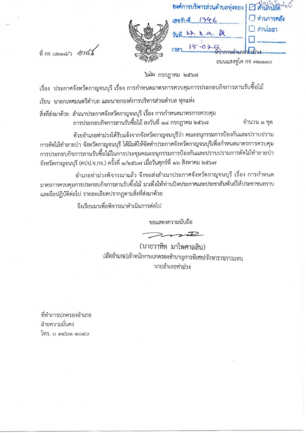 ประกาศ เรื่อง การกำหนดมาตรการควบคุมการประกอบกิจการลานรับซื้อไม้