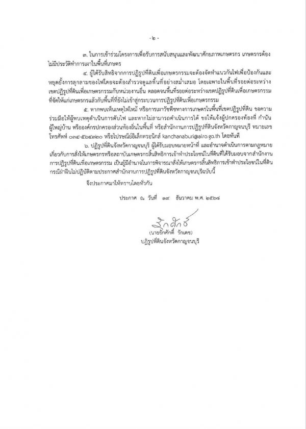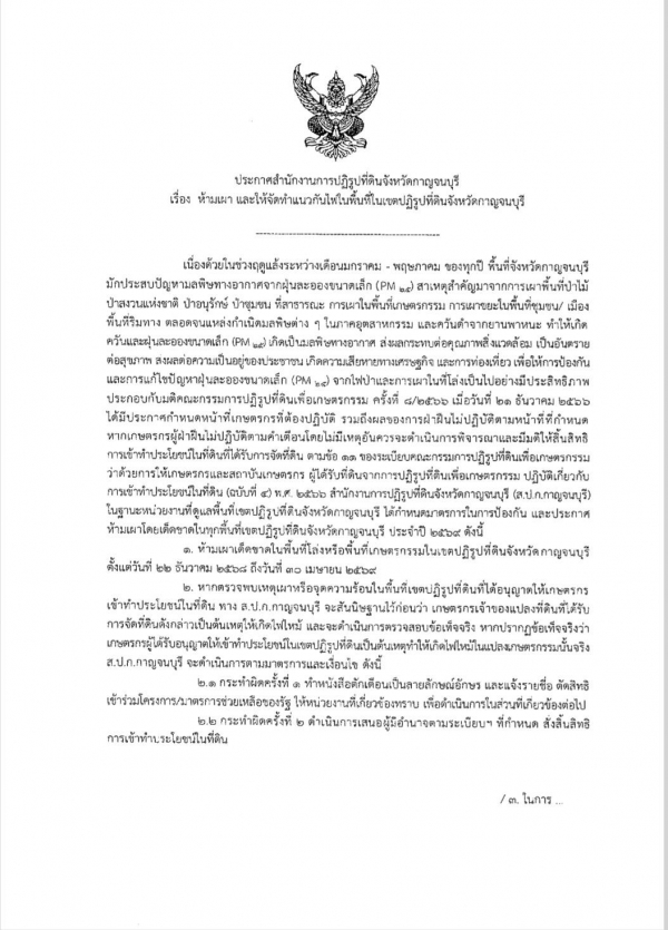 ข่าวประชาสัมพันธ์เรื่อง ห้ามเผาและให้จัดทำแนวกันไฟในพื้นที่ในเขตปฏิรูปที่ดินจังหวัดกาญจนบุรี